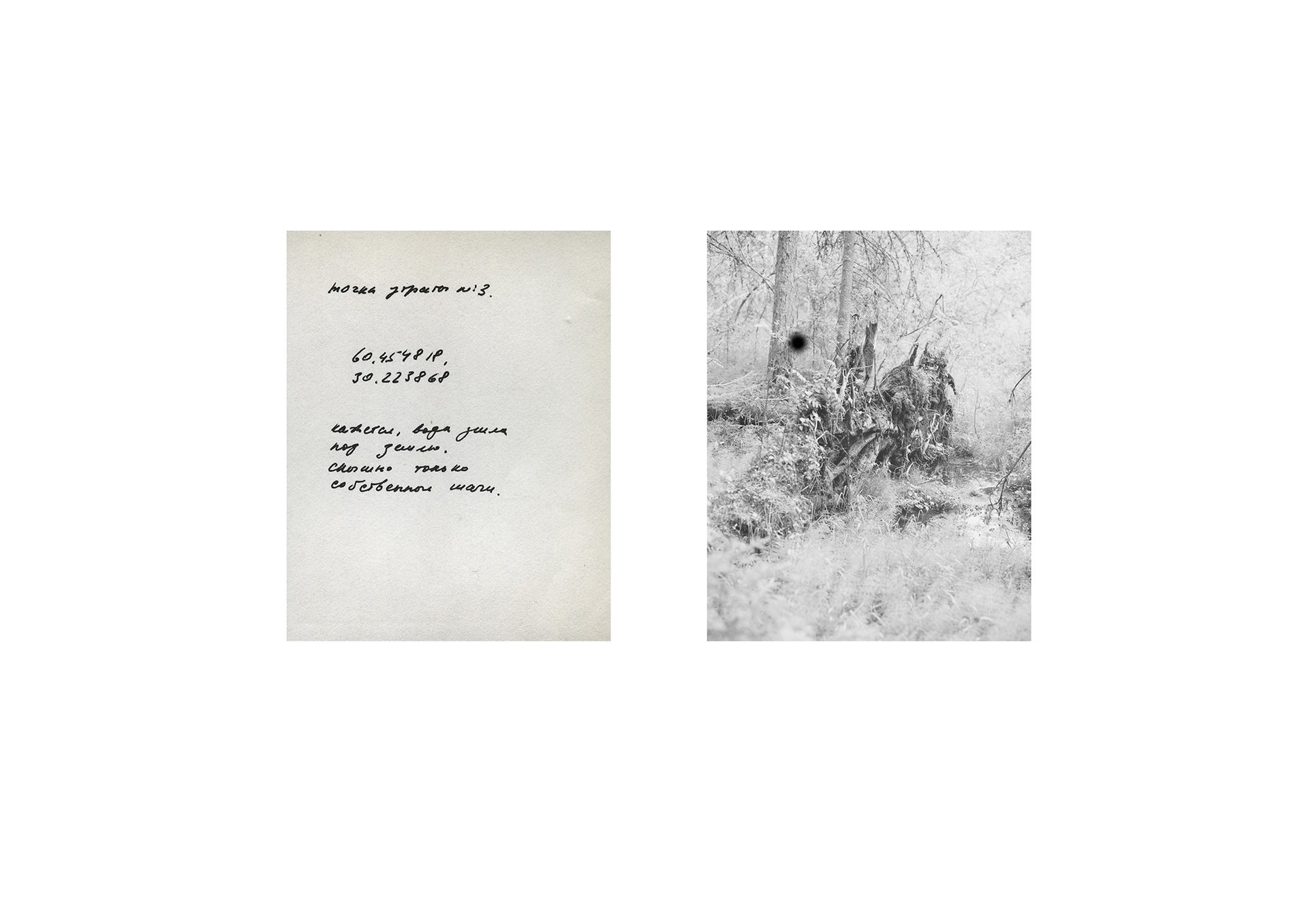 My route follows the Smorodinka River in the forest. Its name echoes another river, the mythical Smorodina, a pivotal river of East Slavic tales and a symbol of the boundary between the world of the living and the world of the dead, an analogue of the ancient Greek Styx. The juxtaposition of the real and the mythical rivers allows the documentary and the archetypal to stand side by side: the topography of grief and the universal image of transition.