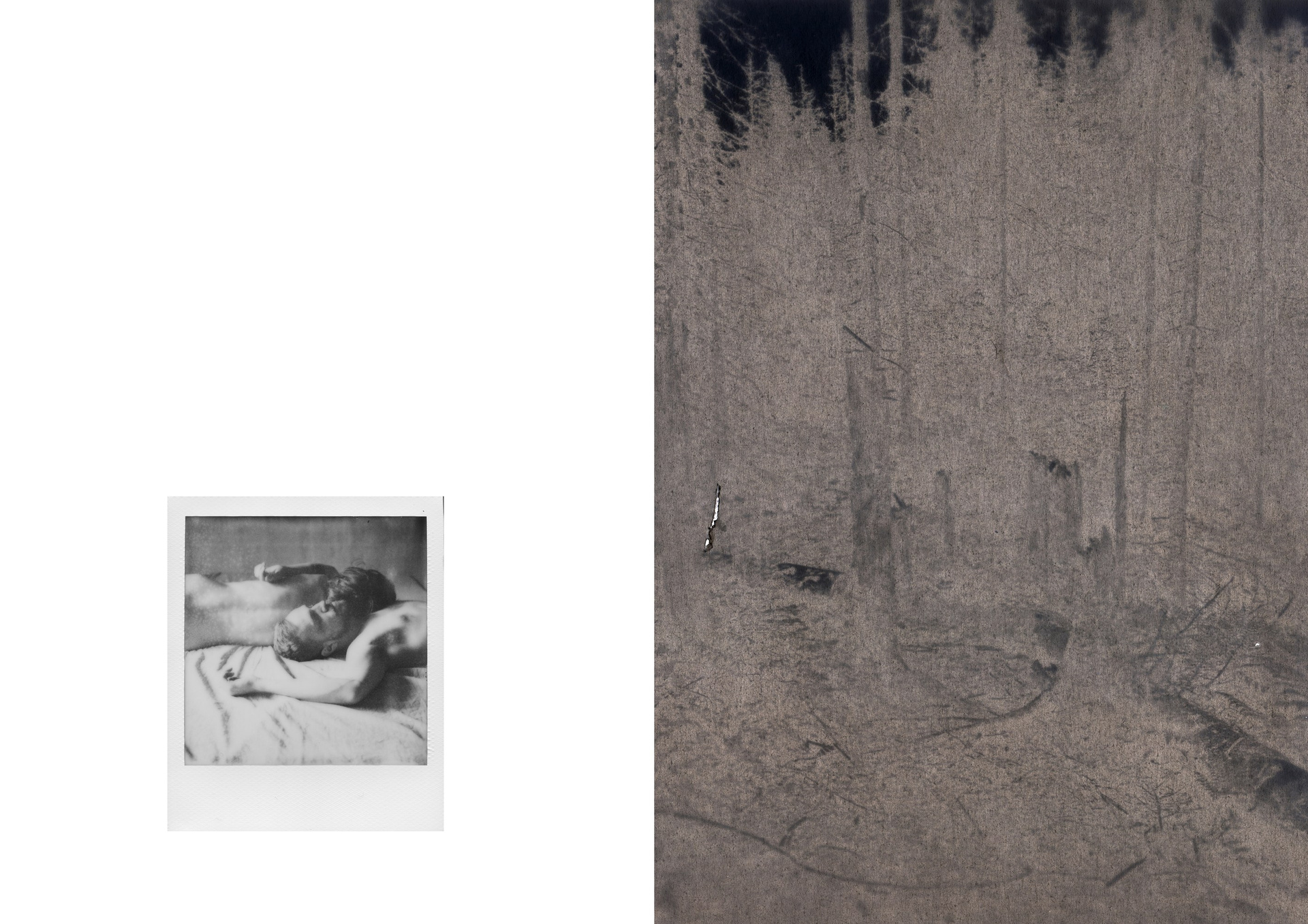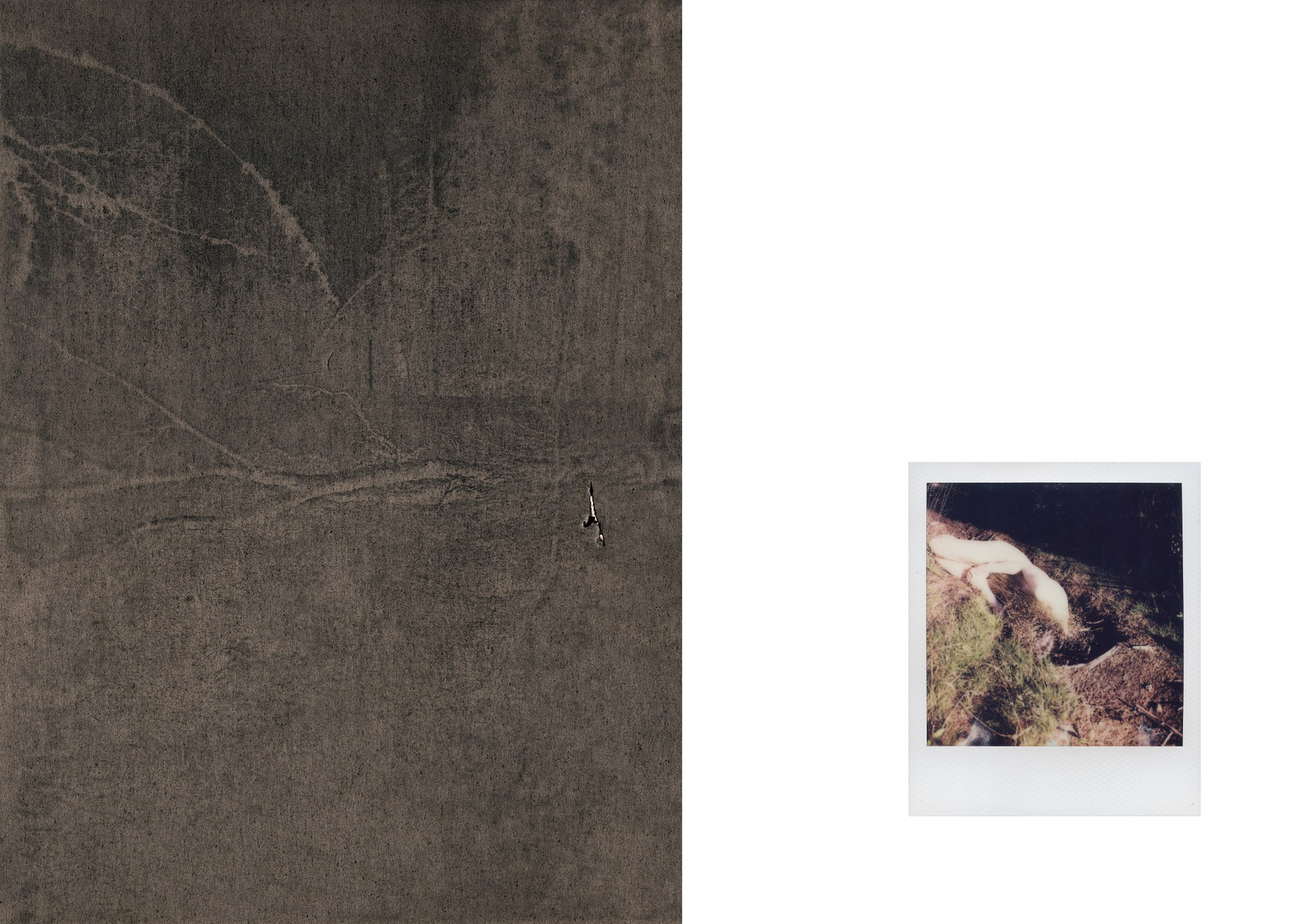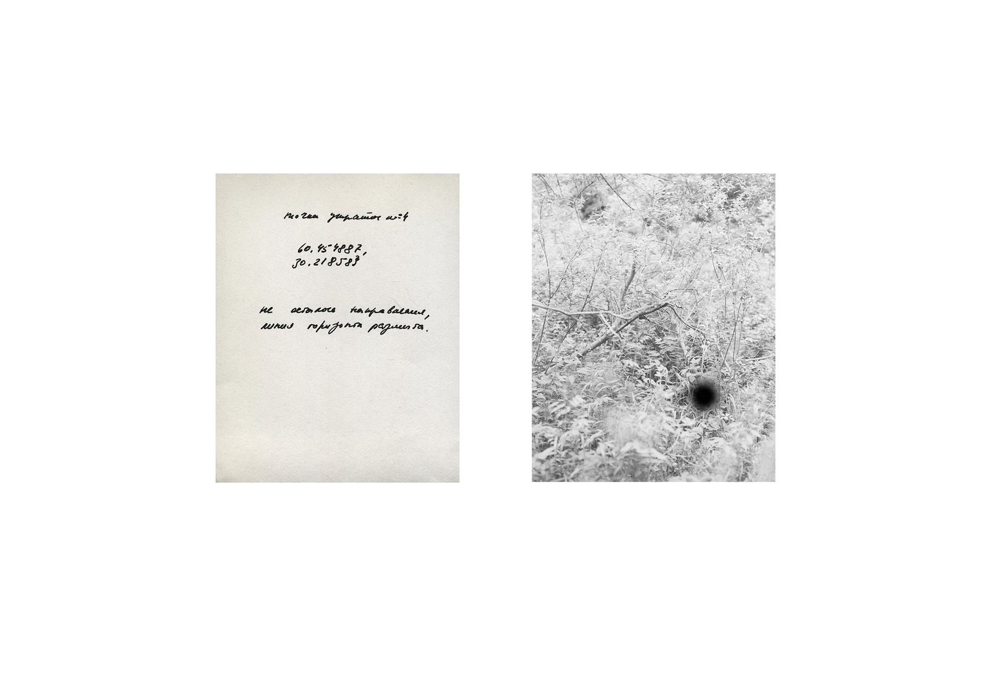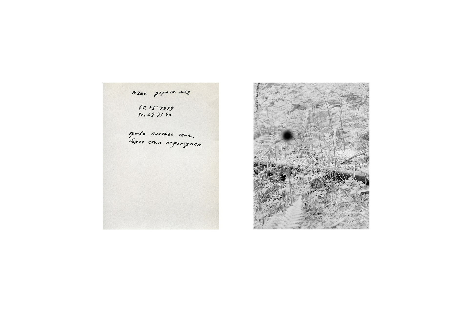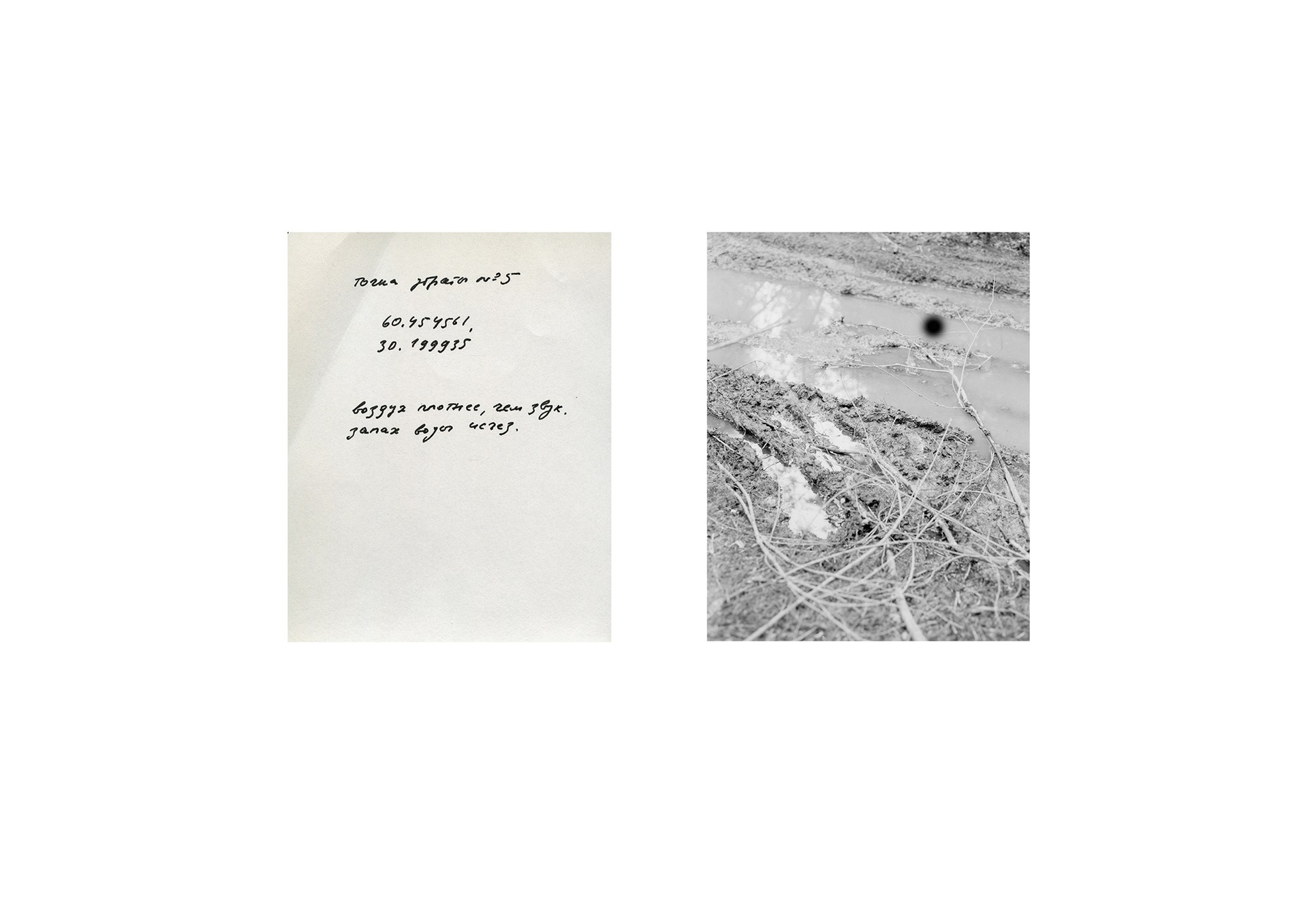 The landscape here is not a passive backdrop but a companion and a vessel of traces. It both preserves and conceals the imprints of experience, creating a space for reflection on memory, which is rarely stable: it resists disappearance, its credibility remains under tension. A two-channel video, filmed back in the city near the place of death, records the path of two people—two worlds that no longer intersect.